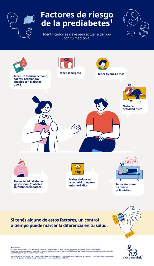 Recordá que es importante realizar controles médicos de manera regular, especialmente si existen factores de riesgo. Se puede hacer una prueba sencilla de azúcar en la sangre para detectar la prediabetes. ⁵ Consultá a tu médico/a ante cualquier duda.